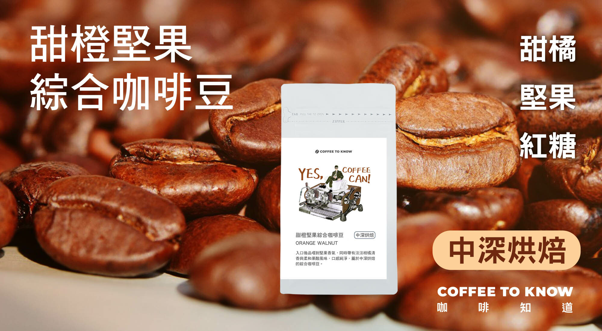 風味:入口後品嚐到堅果香氣,同時帶有淡淡柑橘甜香與柔和果酸風味,口感純淨,屬於中深烘焙的綜合咖啡豆。