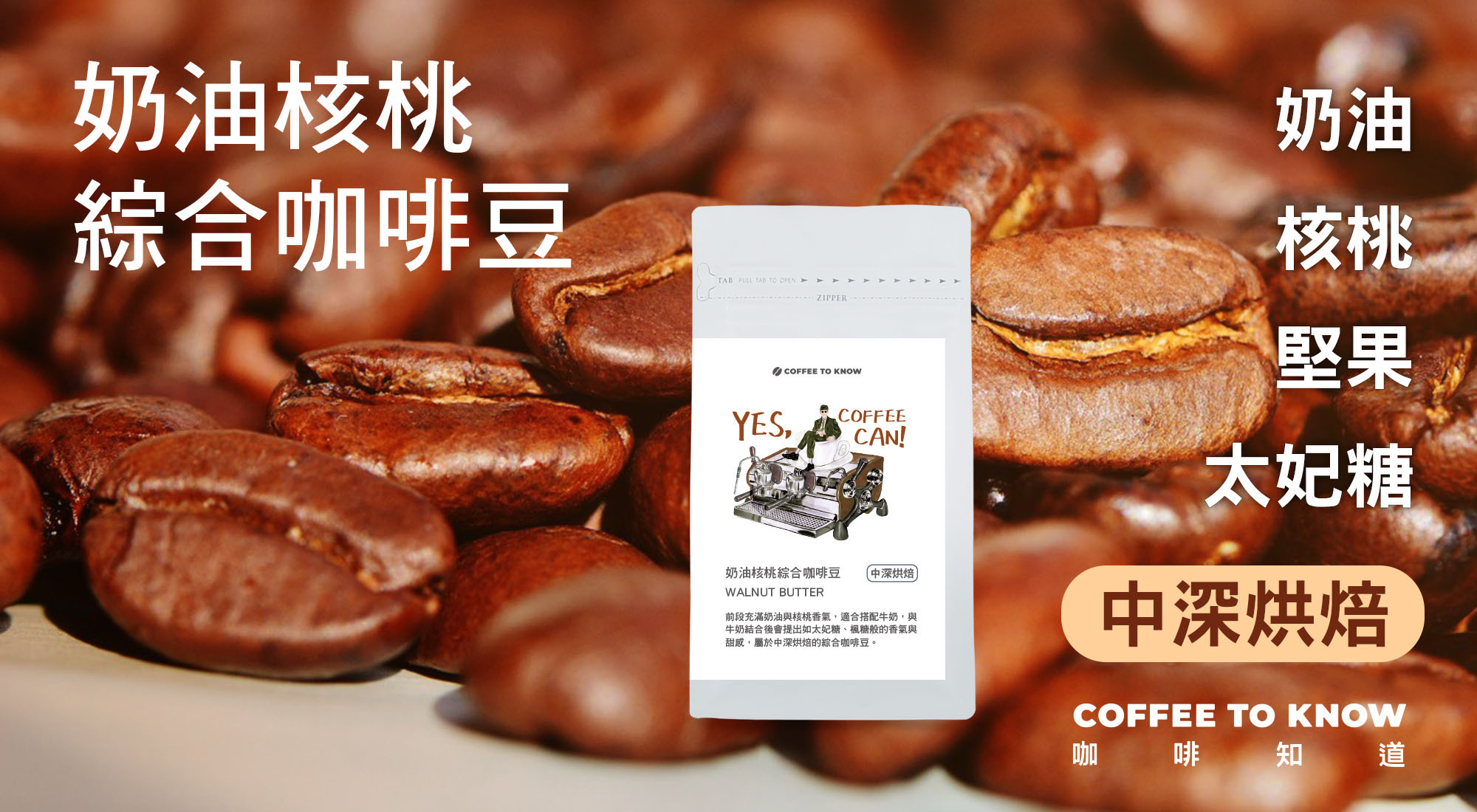 風味:前段充滿奶油與核桃香氣,適合搭配牛奶,與牛奶結合後會提出如太妃糖、楓糖般的香氣與甜感,屬於中深烘焙的綜合咖啡豆。